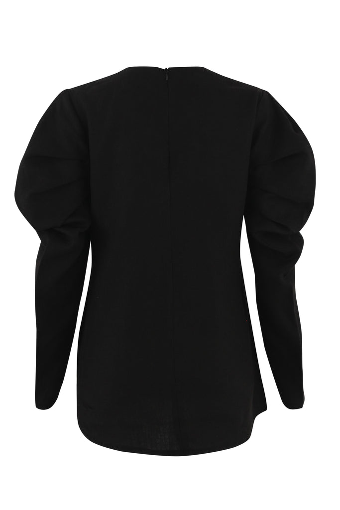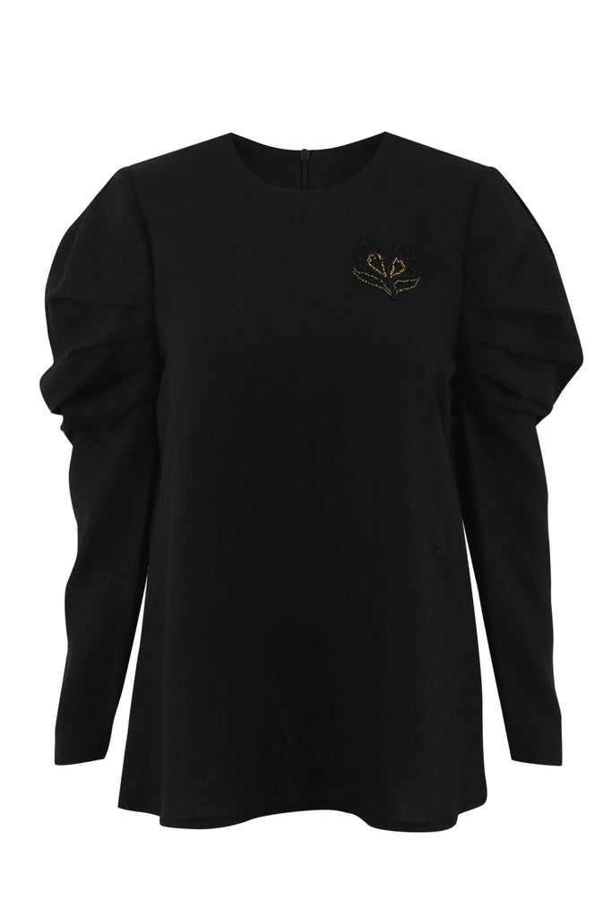 A statement in silent strength, the She Knows Blouse is cut from pure black linen and designed with architectural puff-pleated sleeves that command attention without a word. At once austere and romantic, its clean silhouette is punctuated by a delicate bead-embroidered motif on the left side—a whisper of heritage, like a family crest reborn under candlelight.