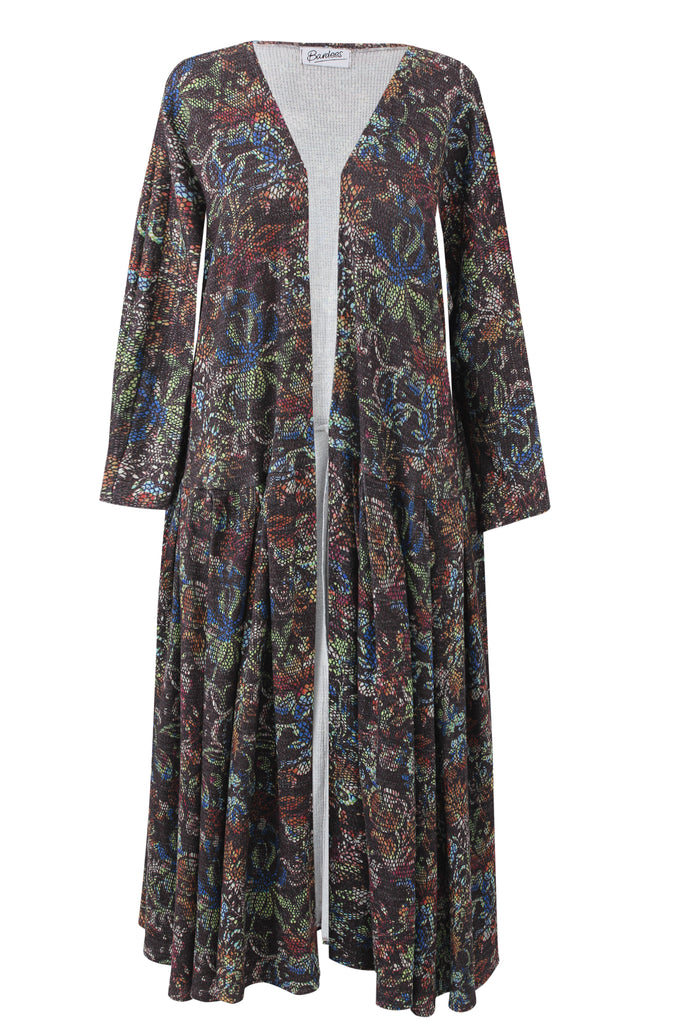 Moonlit Serenity – CANVA is a long, flowy kimono cut in our signature relaxed shape, printed with the CANVA artwork: a dark, painterly base layered with multicolour abstract florals and textures. Think night garden, city lights, and a little bit of drama.