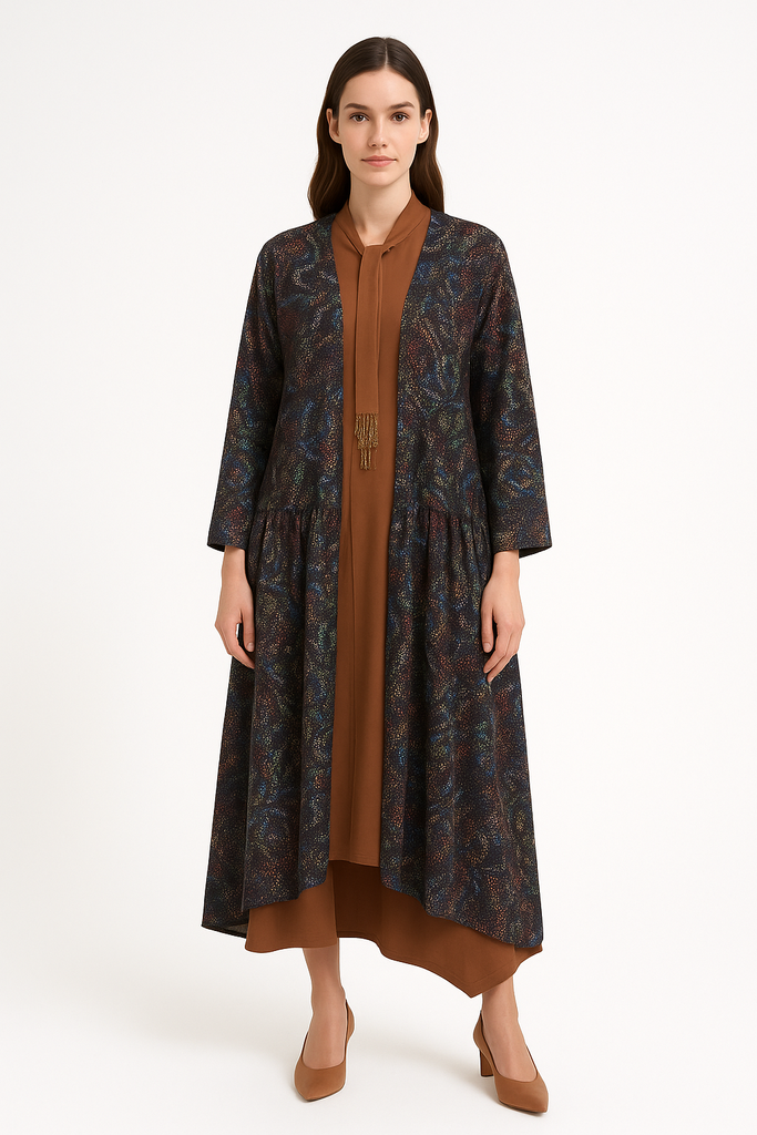 The soft printed knit drapes beautifully, has gentle stretch, and works over literally everything – basics, dresses, wide-leg pants, airport looks, Ramadan nights, office to dinner… it’s that one piece you grab when you want impact without effort.
