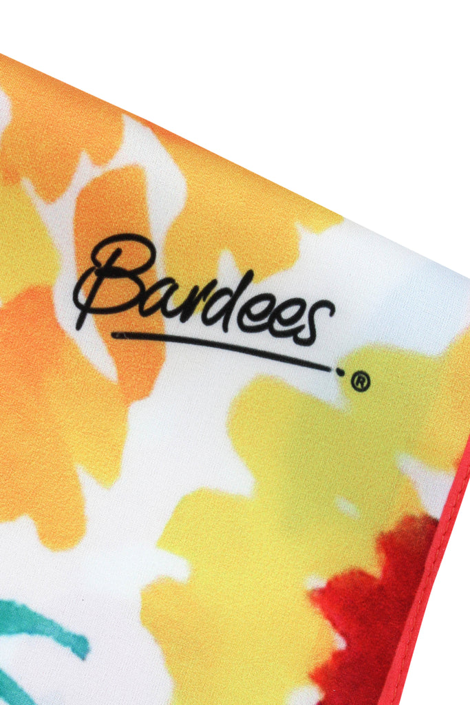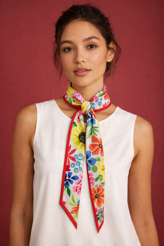 The Moonlit Serenity – SLIM SCARF – SPRING FLORAL is a light, playful slim scarf printed on Premium satin. The SPRING FLORAL artwork is a hand-painted garden of bright yellow, coral, pink, blue and green florals on a fresh white base, framed with a vivid contrast border. It feels like a sketchbook of flowers wrapped around your neck.