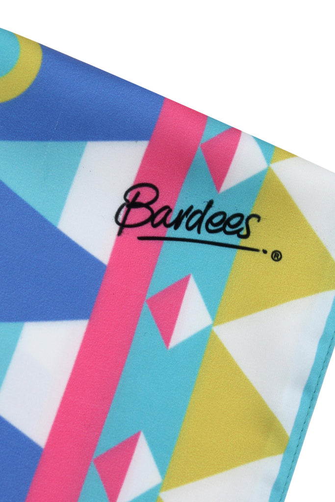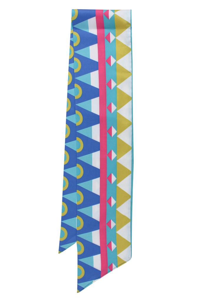 The Moonlit Serenity – SLIM SCARF – TRIBAL is a bold, geometric slim scarf in Premium lightweight satin. The TRIBAL print mixes sharp triangles, colour-block stripes and circular motifs in electric blue, turquoise, hot pink and mustard – a little bit retro, a little bit festival, very Bardees.